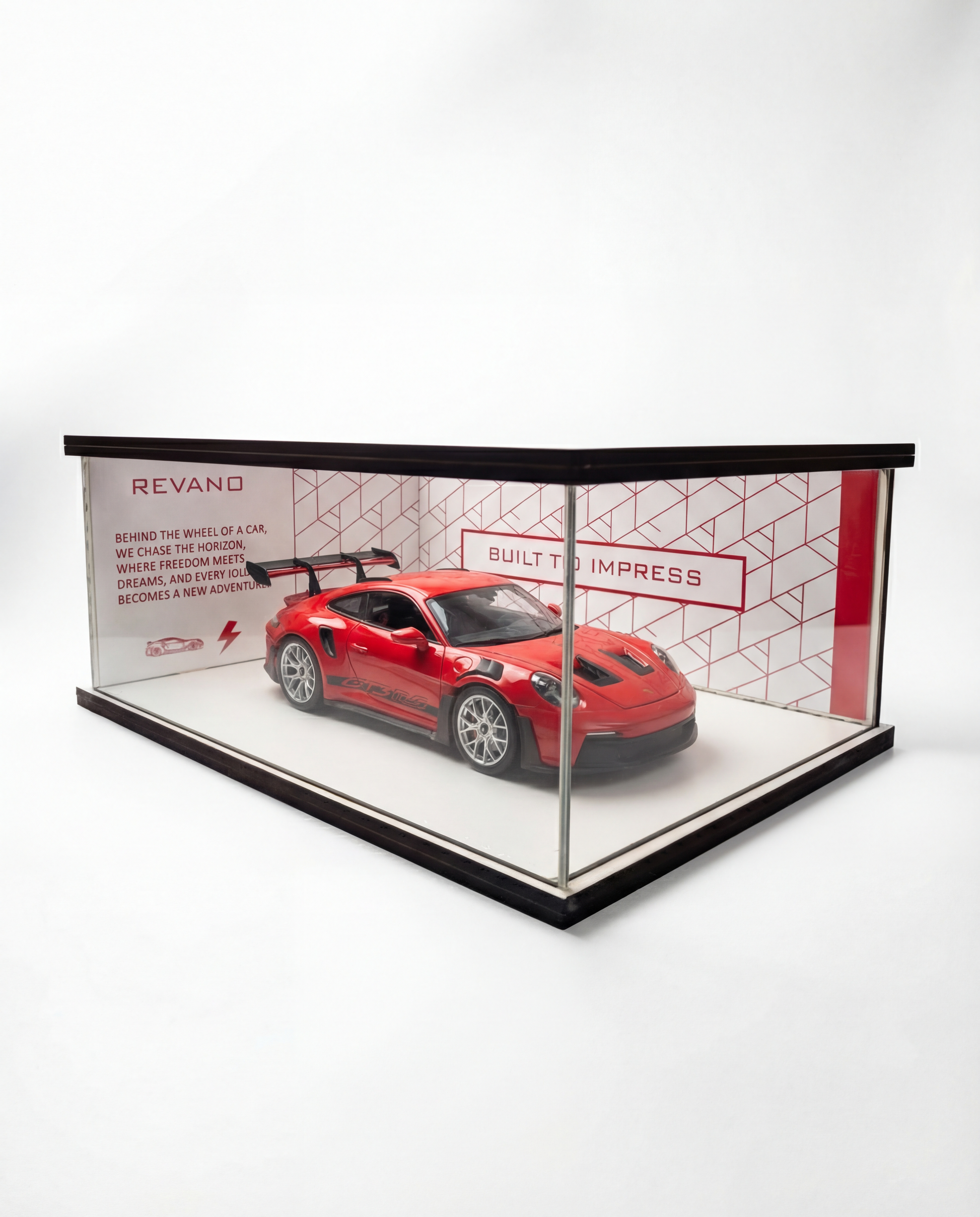 The iconic Porsche 911 GTS RS, comes in the bold and sleek Flare Showroom, designed to elevate any desk, shelf, or display corner.