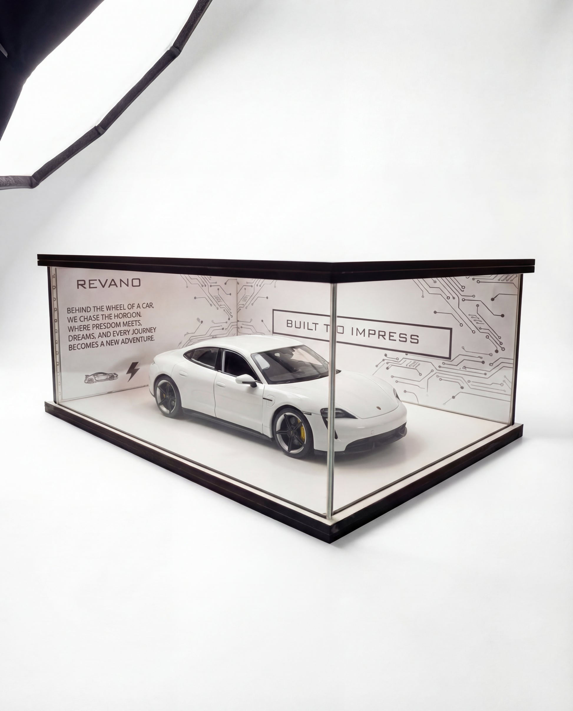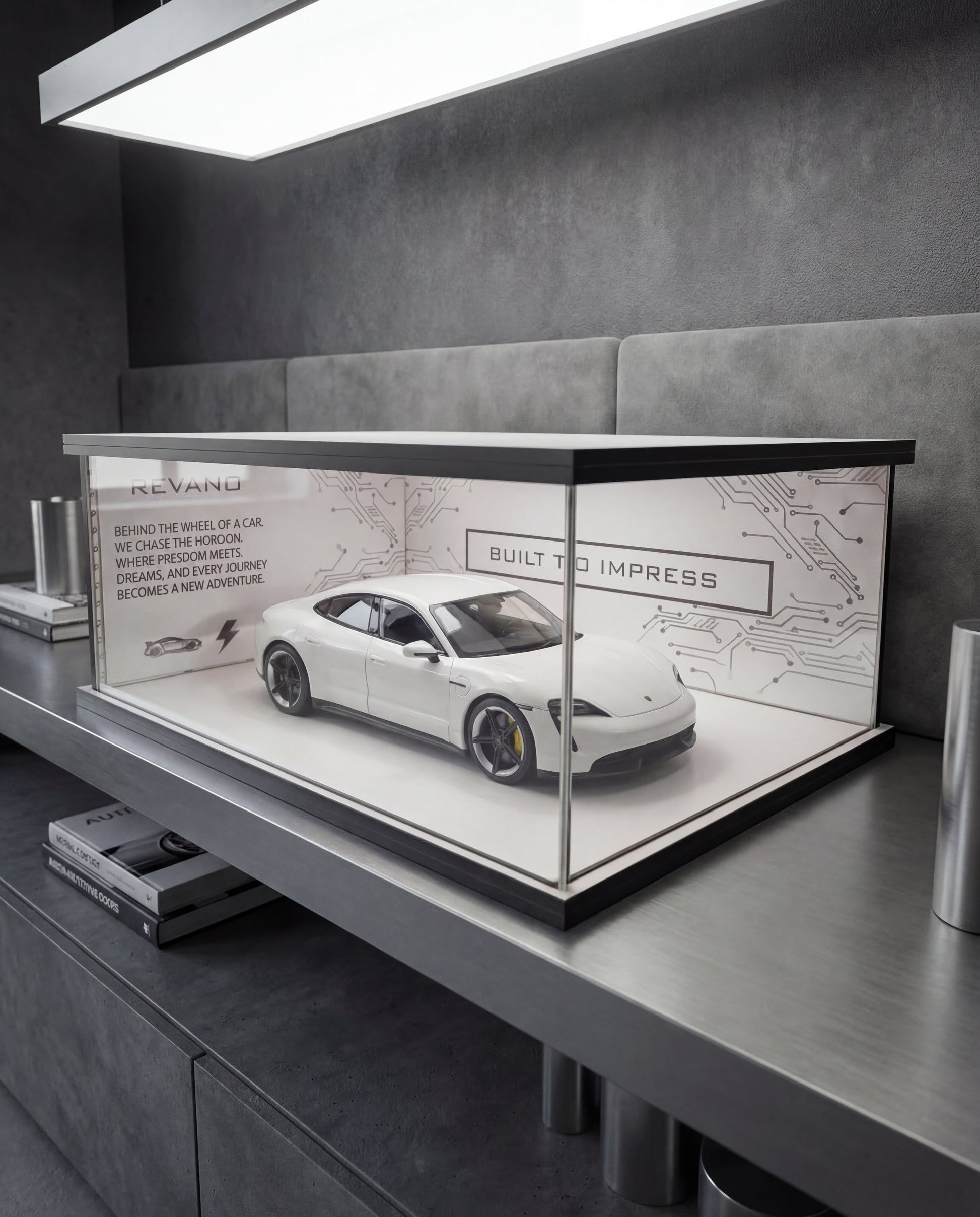 The iconic PORSCHE TAYCAN, comes in the bold and sleek Shadow Showroom, designed to elevate any desk, shelf, or display corner.